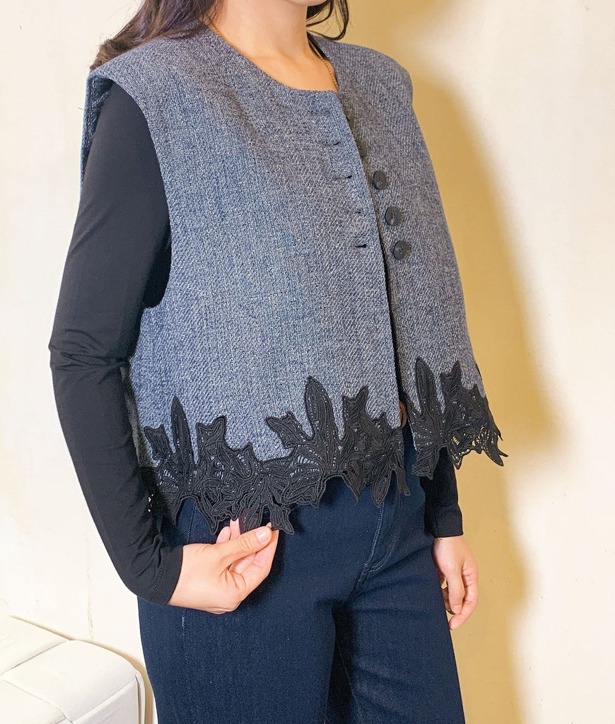 Dark denim wool vest with floral hem
